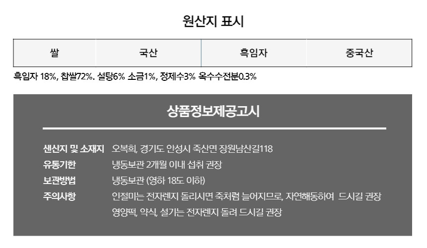 (흑임자18%,찹쌀72%,설탕6%,소금1%,정제수3%,옥수수전분0.3%,알파아밀라아제)