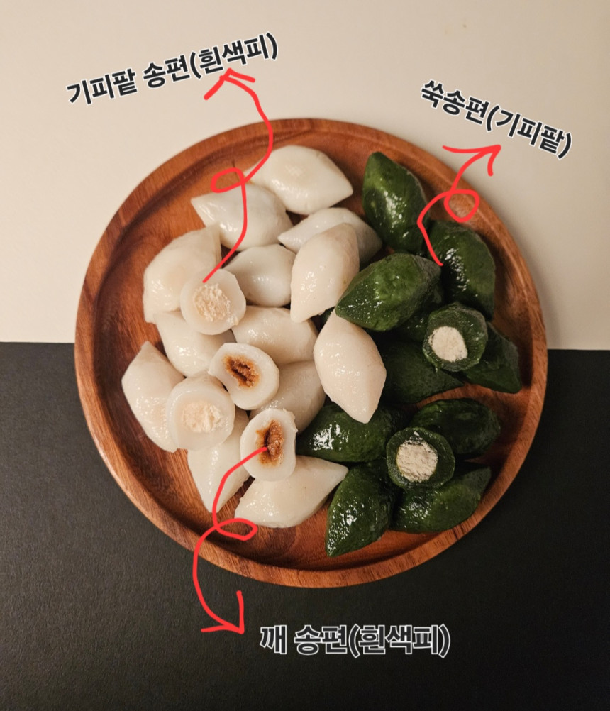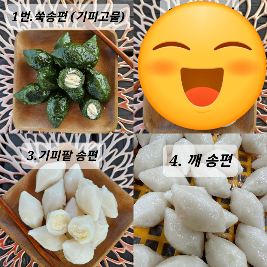 ✔️올해는 3가지 종류만 판매합니다. 1. 쑥 송편 (기피고물) 3. 기피팥 송편 (흰색 피) 4. 깨 송편 (흰색 피) 배송날짜 지정은 주문시 요청사항에 적어주세요.